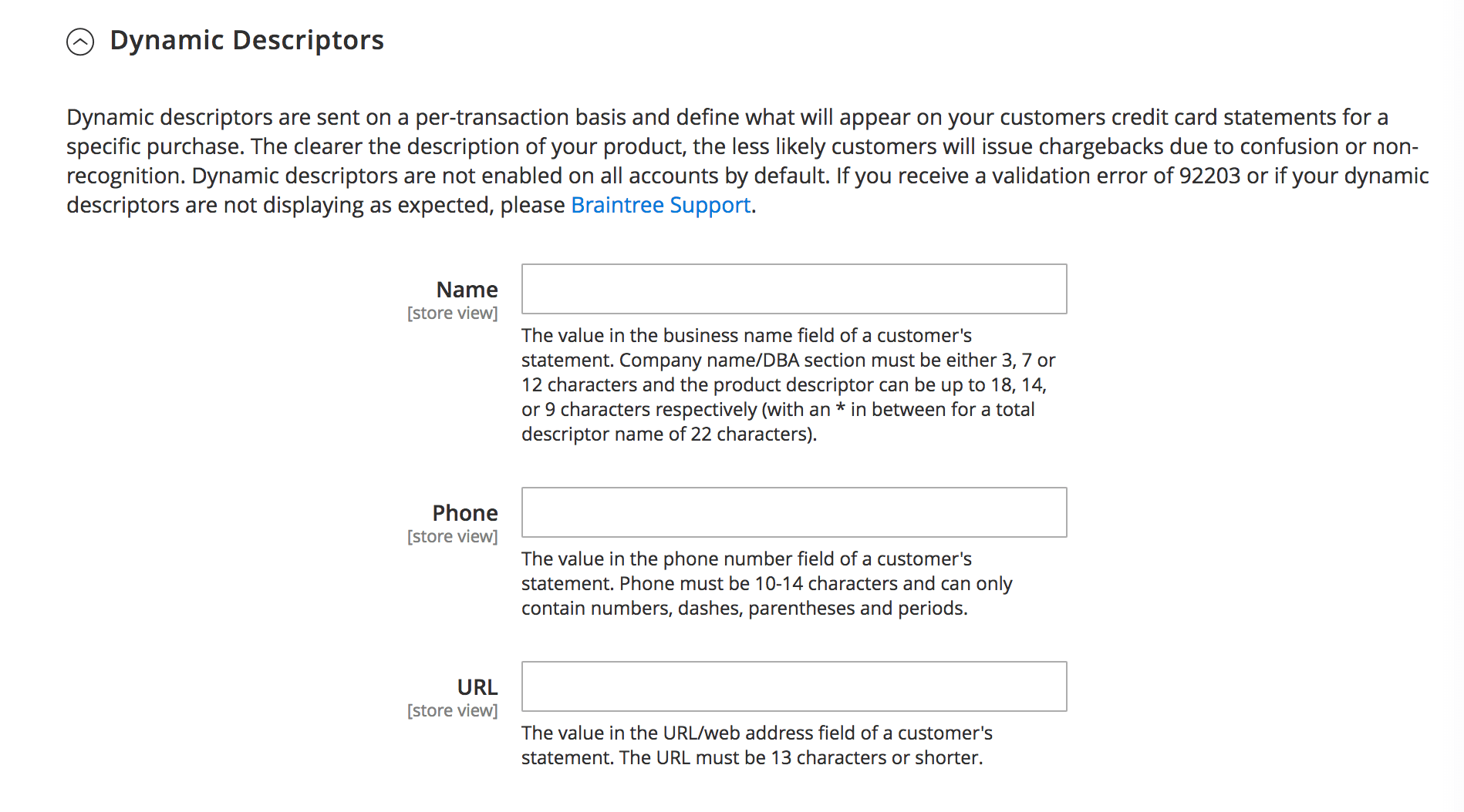 - All the descriptors given below are used to identify purchases on customer credit card statements. It is possible to reduce the number of chargebacks by clearly identifying the company that is associated with each purchase. Reach out to Braintree Support to activate the Dynamic Descriptors.